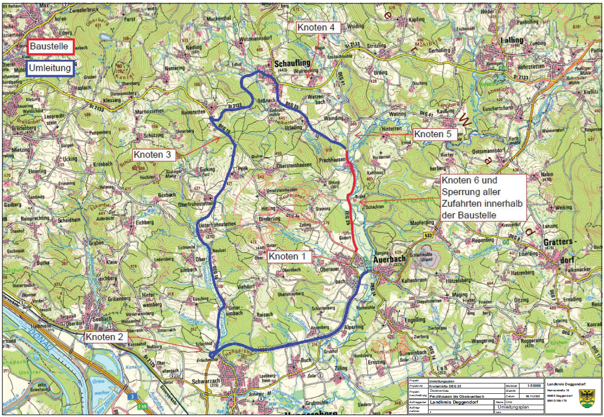 Die Umleitung nächste Woche führt über die Kreisstraße DEG 10 (Hainstetten - Frohnstetten - Schwarzach) und anschließend über die B533, da der Kreuzungsbereich bei Oberauerbach ebenfalls saniert wird und deswegen gesperrt werden muss. Einen Lageplan mit eingezeichneter Baustelle und Umleitung finden Sie im Anschluss.